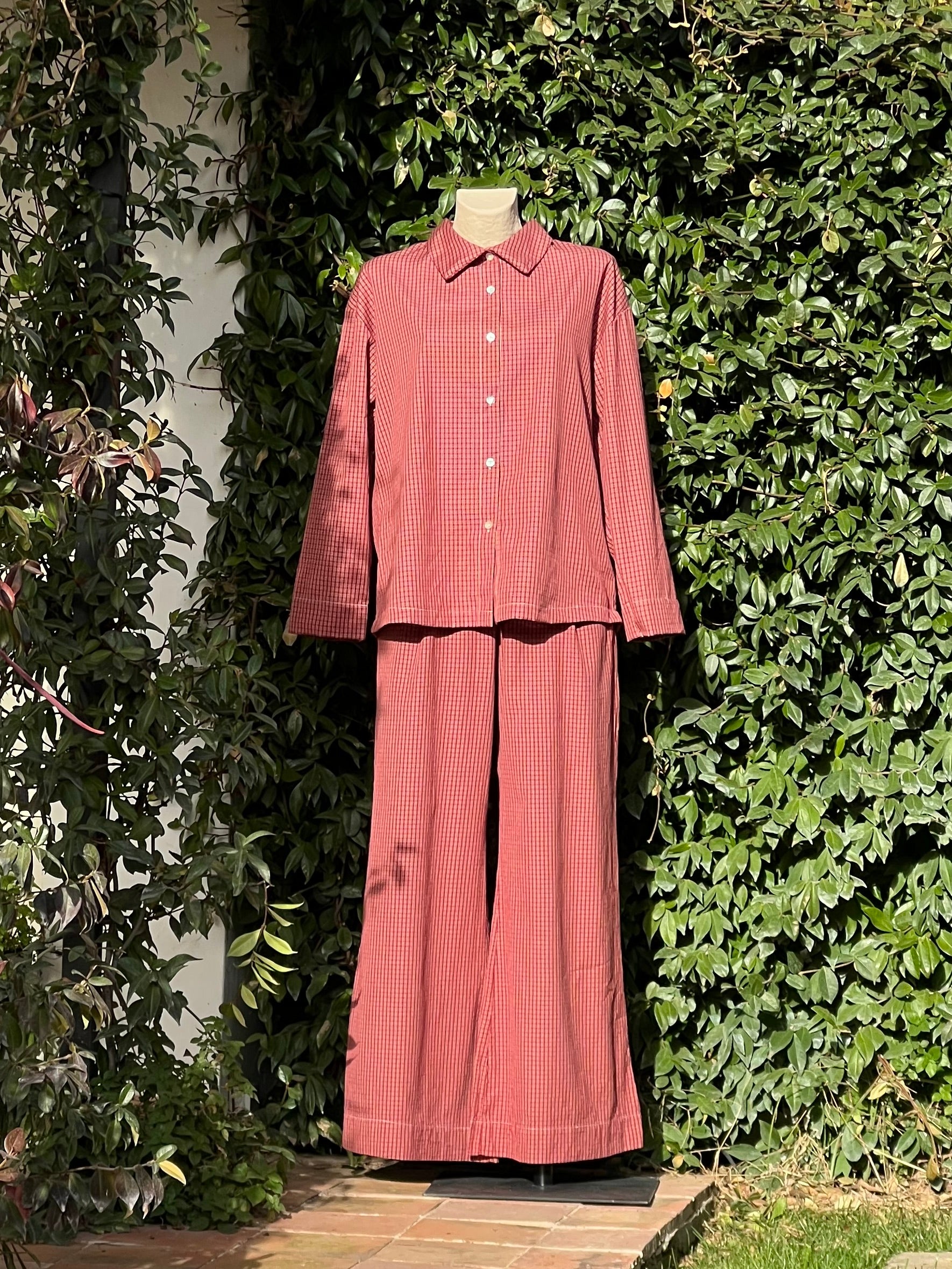 Nuestros pijamas están confeccionados íntegramente con materiales 100% naturales. El tejido es de algodón puro, y todos los hilos de costura y las etiquetas también son de algodón. Los botones son de nácar natural, y la parte trasera de la cintura incluye un elástico hecho de una mezcla de algodón y caucho natural. No utilizamos fibras sintéticas, para que puedas vestir con conciencia y coherencia.